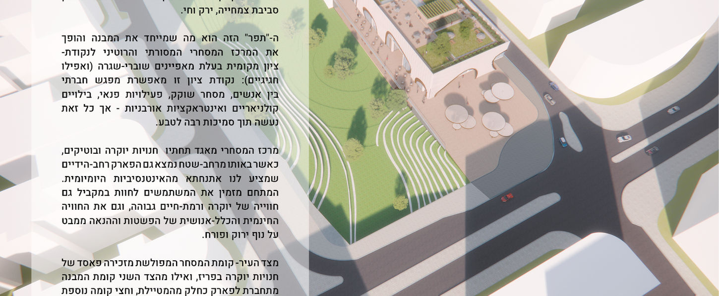 מבנה המרכז המסחרי שוכן בלב השכונה החדשה והירוקה נווה גן. המבנה מייצג תפר בין העיר לטבע, בעודו מסמן נקודת מפגש בין מאפיינים אורבניים לבין סביבת צמחייה, ירק וחי. ה-"תפר" הזה הוא מה שמייחד את המבנה והופך את המרכז המסחרי המסורתי והרוטיני לנקודת-ציון מקומית בעלת מאפיינים שוברי-שגרה (ואפילו חגיגיים): נקודת ציון זו מאפשרת מפגש חברתי בין אנשים, מסחר שוקק, פעילויות פנאי, בילויים קולניאריים ואינטראקציות אורבניות - אך כל זאת נעשה תוך סמיכות רבה לטבע. המרכז המסחרי מאגד תחתיו חנויות יוקרה ובוטיקים, כאשר באותו מרחב-שטח נמצא גם הפארק רחב-הידיים שמציע לנו אתנחתא מהאינטנסיביות היומיומית. המתחם מזמין את המשתמשים לחוות במקביל גם חוויה של יוקרה ורמת-חיים גבוהה, וגם את החוויה החינמית והכלל-אנושית של הפשטות וההנאה מהמבט על נוף ירוק ופורח.